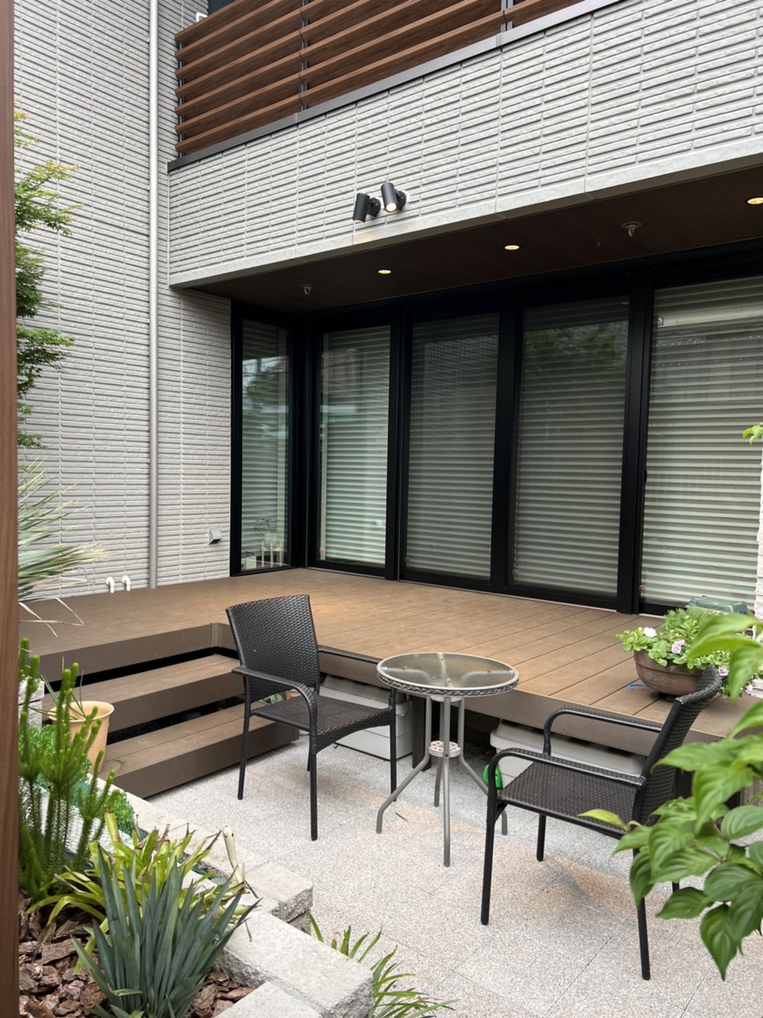 お庭には、メンテナンスフリーな人工木「樹ら楽ステージ」を広々と施工。周囲を「フェンスAB」で囲うことで、外部からの視線を気にせず過ごせるプライベートな「第2のリビング」を創出しました。
