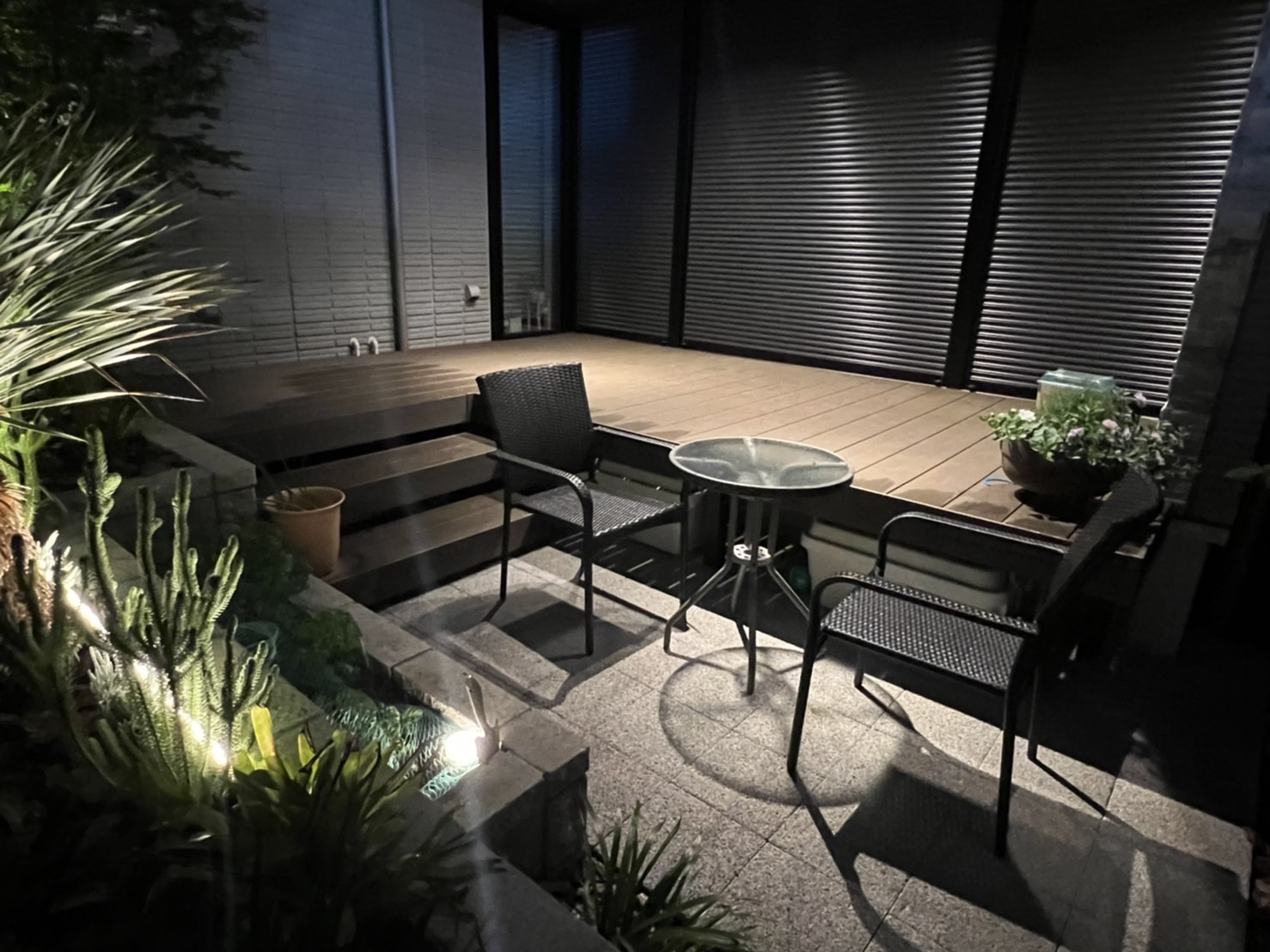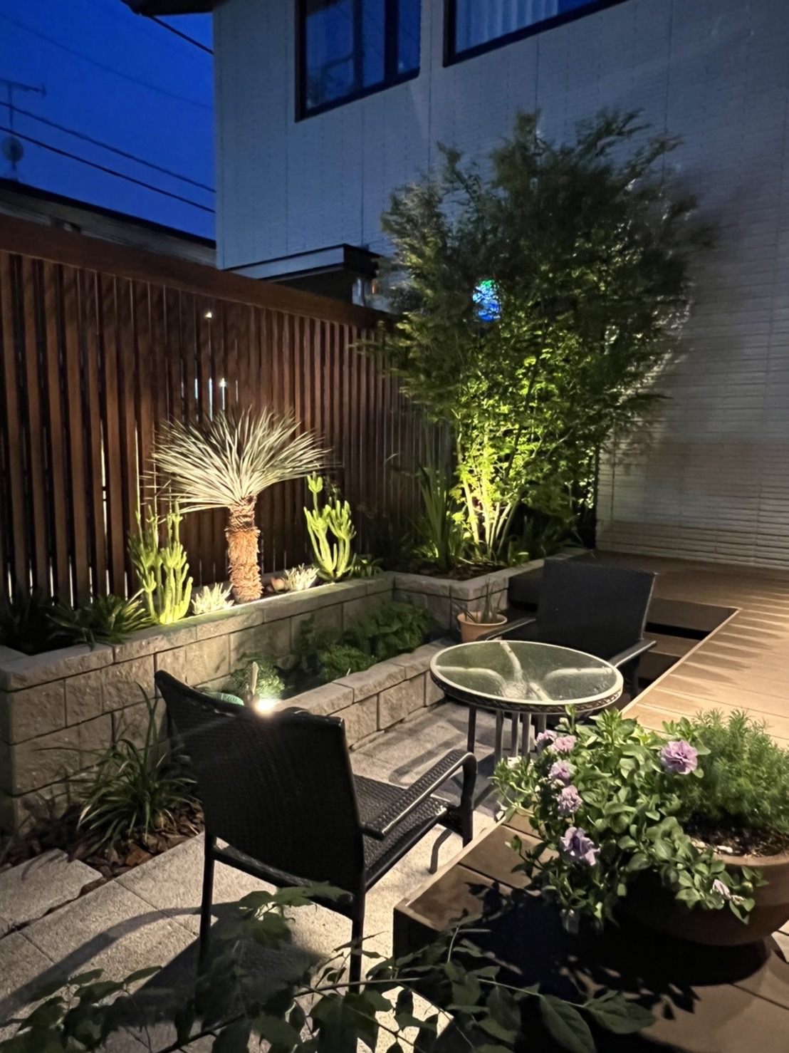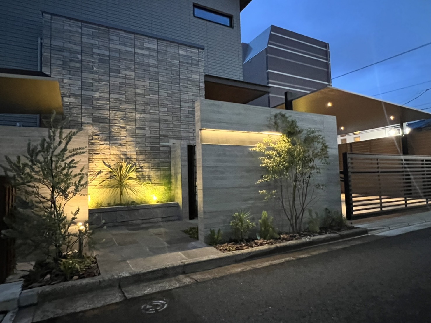 夜間はエクステリアライト「美彩」が点灯。カーポートの軒下や植栽、アプローチをドラマチックに照らします。光の反射を計算し、眩しさを抑えつつ「死角を作らない」配置は、自社職人が現場で何度も調整を重ねた成果です。