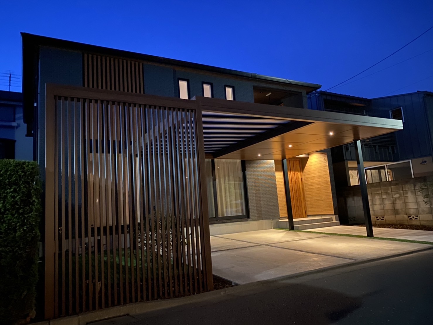 「プラスG カールーフ」がつくる圧倒的な邸宅感。光とラインを計算した至高の車庫空間 1. お客様のお悩み(Before) 「建物のグレードに見合う、一体感のあるカースペースと門周りにしたい」 練馬区の閑静な住宅街に新築された施主様。モダンで洗練された建物に対し、既製品を置くだけのカースペースでは「住まいの顔」として物足りないというお悩みをお持ちでした。 プライバシーと開放感の両立: 道路からの視線を遮りつつ、閉塞感のないエントランスにしたい。 夜間の意匠性: 夜、車で帰宅した際に美しく迎え入れてくれる演出が欲しい。 トータルコーディネート: カースペースと門周りをバラバラにせず、一つの「空間」としてまとめたい。 2. プロの提案と工夫(Process) 「空間を仕切る」から「空間を作る」へ。LIXILとYKKのベストミックス 建物の水平ラインを強調し、住まい全体を大きく見せるために、LIXILの「プラスG」を主軸にしたプランニングを行いました。 LIXIL「プラスG カールーフ」の構造美: 「屋根」という概念を超え、建物の一部としてデザインできるカールーフを採用。写真からもわかる通り、木調の天井材が玄関ポーチまで連続するような視覚効果を狙い、建物との圧倒的な一体感を生み出しました。 夜間を彩るライティング計画: 天井面にフラットに埋め込まれたダウンライトが、車体を均一に美しく照らします。これはLIXILの「美彩」シリーズを組み合わせたもので、夜間の防犯性を高めると同時に、住まいに高級ホテルの車寄せのような風格を与えています。 YKK「ルシアスウォール」による重厚な門周り: 門周りには、プラスGの質感に合わせたYKK APの「ルシアスウォール」を配置。ポストまでトータルで木調カラーを統一することで、ノイズを排除したミニマルで洗練されたファサードを完成させました。 職人による精密な納まり(自社施工): プラスGの最大の特徴である「フレーム」のライン出しには細心の注意を払いました。現場の勾配や境界線に合わせ、自社職人がミリ単位で調整。特にフレームが重なる部分や、建物との隙間の処理は、徳永工業が誇る熟練技術の証です。 3. 完成後の変化(After) 施工完了後、カースペースは単なる「駐車場」から、住まいの風格を決定づける「エントランスラウンジ」へと進化しました。 所有する喜びの最大化: 洗練された木調天井とダウンライトの演出により、車を降りるたびに「この家を建てて良かった」と感じる満足感をお届けできました。 機能的な防犯性能: 暗くなると自動点灯するライティングが、不審者を寄せ付けない安心感を提供しています。 メンテナンスと信頼: 徳永工業はLIXILエクステリアマイスター店として、確かな知識と施工技術でこの美しい景観を末長く守ります。 徳永工業から「邸宅外構」をご検討の施主様へ 「プラスG」のようなハイエンド商品は、その施工品質によって仕上がりに大きな差が出ます。 私たちは、単に製品を組み立てるだけでなく、建物とのバランス、夜の光の広がり、数年後の耐久性までを見据えて施工します。練馬区周辺で「唯一無二の外構」を実現したい方は、ぜひ徳永工業へお任せください。