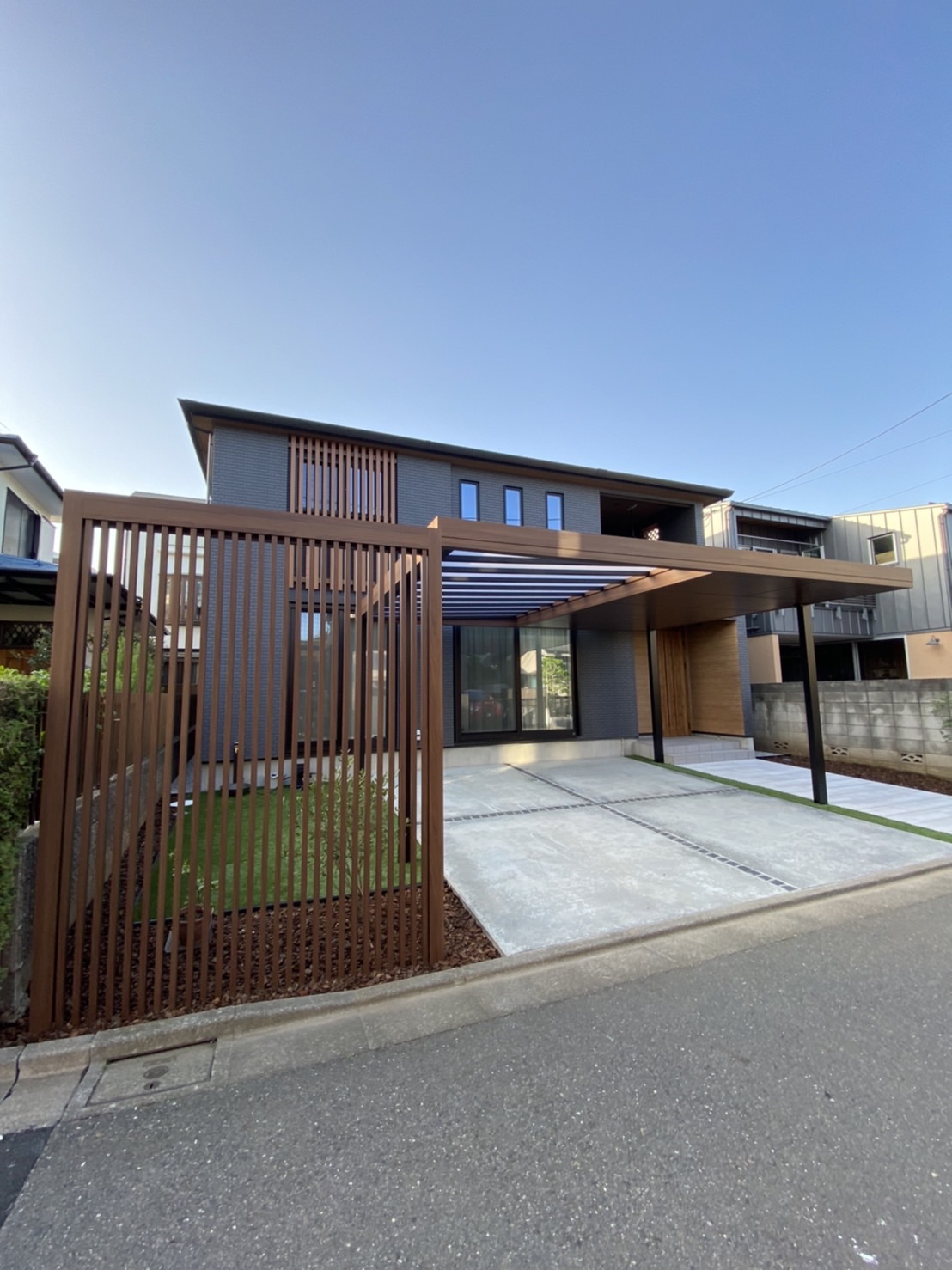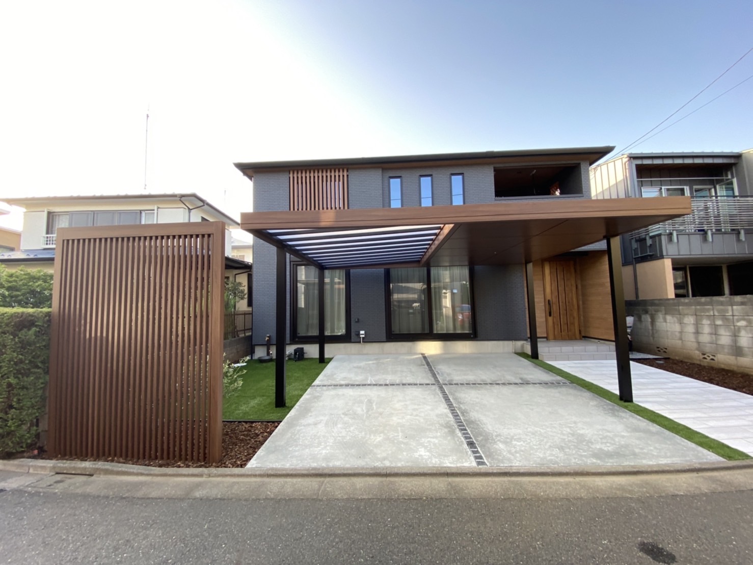 練馬区の閑静な住宅街に新築された施主様。モダンで洗練された建物に対し、既製品を置くだけのカースペースでは「住まいの顔」として物足りないというお悩みをお持ちでした。